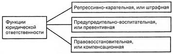 1) репрессивно-карательная (некоторые авторы называют ее мягче - штрафной, хотя суть от этого не меняется). Она свидетельствует о том, что юридическая ответственность является, во-первых, актом возмездия государства по отношению к правонарушителю; во-вторых, средством, предупреждающим новые правонарушения; 2) предупредительно-воспитательная, или превентивная, функция, тесно связанная с репрессивно-карательной. Она призвана обеспечить формирование у адресатов права мотивов, побуждающих соблюдать законы, уважать права и законные интересы других лиц; 3) правовосстановительная, или компенсационная, функция присуща имущественной ответственности. Взыскание причиненного вреда с правонарушителя компенсирует потери потерпевшей стороны, восстанавливает ее имущественные права. К основным принципам юридической ответственности можно отнести (рис. 4):