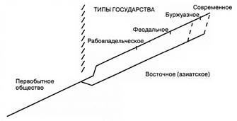 Нашей юридической наукой рассматривались в основном четыре типа государства: рабовладельческий, феодальный, капиталистический и социалистический. Между тем первые два типа существовали только в Европе, в остальном мире - в Азии, Африке и Америке - государства были иными, относились к «восточному типу». Восточный тип государства. Именно этот тип государства был первым в истории человеческой цивилизации. Самые первые государства возникли в зонах поливного земледелия около 4-5 тыс. лет назад (Египет, Элам, индийские и китайские государства). Экономической предпосылкой их появления было резкое повышение производительности труда, ставшее возможным благодаря строительству оросительных систем. Однако, как это отмечалось выше, такой характер сельскохозяйственного производства требовал сохранения общины: одна семья не могла обеспечить проведения объемных ирригационных работ. Поэтому там не появилась частная собственность на землю, не возникли классы - собственники средств производства. В процессе государствообразования создалось общество, построенное по образцу пирамиды: наверху - единовластный монарх (царь, фараон, хан и т.п.), ниже - круг его ближайших советников (визирей, «министров»), далее - чиновники более низкого ранга. В основании пирамиды - сельскохозяйственные общины. Последние и являлись объектом эксплуатации, отдавая государственному аппарату в виде налогов значительную часть общественного продукта. «Классовая» принадлежность человека в восточном обществе определялась не формальной собственностью на основные средства производства (земля считалась собственностью общины), а реальным положением в общественно-государственной «пирамиде»: был ли он общинником или государственным чиновником, а в последнем случае - его местом в иерархии государственного аппарата. Чиновники наиболее низкого ранга постоянно жили в общинах и были связующим звеном между ними и более высокой частью аппарата. В восточном обществе существовала и частная собственность: у царя, его приближенных были рабы, дворцы, драгоценности; капиталы и материальные ценности были у части городского населения - купцов и ремесленников. Однако в этом обществе частная собственность не играла существенной роли в общественном производстве. Основная доля общественного богатства создавалась трудом свободных общинников или рабов, находящихся в собственности государства и храмов. При этом положение общинников, по сути, мало чем отличалось от положения рабов: и они сами, и их семьи, и их собственность фактически находились в полной зависимости от царя и его ближайшего окружения. Таким образом, на деле существовала единая государственная собственность: государство в лице царя владело «всем и вся», в том числе жизнью и имуществом всех подданных, вплоть до своих приближенных. Такой характер собственности определял структуру общества (его «пирамидальное» устройство), а последняя препятствовала каким-либо существенным преобразованиям. Восточное общество имеет стагнационный характер, не меняется (или меняется незначительно) на протяжении веков и тысячелетий. Так, Древний Египет возник в IV-III тысячелетиях до н.э. и просуществовал более тридцати веков, практически не меняясь. Более 40 веков просуществовало китайское государство. При этом его организационное ус