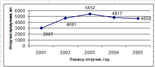 Показатели производства продукции на ОАО «ПЭМЗ» в 2005 году позволяют делать положительный прогноз на 2006 год: предприятие продолжает удерживать позиции на рынках продукции для железнодорожного и городского электротранспорта, специальных электродвигателей и тахогенераторов, МПТ серии П и КГ. Таблица 5 Динамика отгрузок товара в 2004-2005 гг.