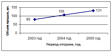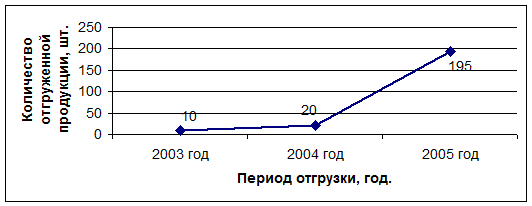 Рис. 4. Динамика продаж фазорасщепителя РФЭ-У1 В 2003 году было изготовлено и отгружено 2 штуки электродвигателя типа ДПТВ-16,25для привода вентилятора охлаждения блока резистора для автомобиля БеЛАЗ. В 2004 году данный двигатель вошел в серийное производство: было продано 172 электродвигателя. Благодаря чёткой организации работ всех подразделений предприятия, ОАО «ПЭМЗ» смог обеспечить производство данного электродвигателя в 2005 году практически бесперебойно, что дало возможность зарекомендовать себя как надёжного поставщика и обеспечить дальнейшее продолжение работ по данному заказу, но уже в комплекте с крыльчаткой. Можно сказать, что ОАО «ПЭМЗ» потеснил «ТАТЭлектромаш», который является основным производителем данного оборудования на протяжении многих лет. В 2006 году планируется отгрузить основному заказчику РУП «БеЛАЗ» г. Жодино около 240 штук электродвигателей в год. Производство тяговых электродвигателей на ОАО «ПЭМЗ» является частью программы по восстановлению, ремонту и модернизации трамвайного парка. Ранее основным поставщиком вагонов была Чехословакия в рамках СЭВ. Сегодня данного предприятия как единого целого уже не существует. Руководство концерна «Сименс» пыталось в 2004 году купить контрольный пакет акций «Силовых машин», однако эту сделку не одобрили российские власти. Сотрудничество по поставке запасных частей с представительством данного гиганта требует немалых средств и чёткого соблюдения всех условий договора. Производство данных электродвигателей в РФ с учётом всех затрат обходится намного меньше, что является основным приоритетом принятия решения по изготовлению ТАД на отечественных предприятиях. Таблица 11 Динамика отгрузки тягового двигателя ТАД-21для привода трамвая