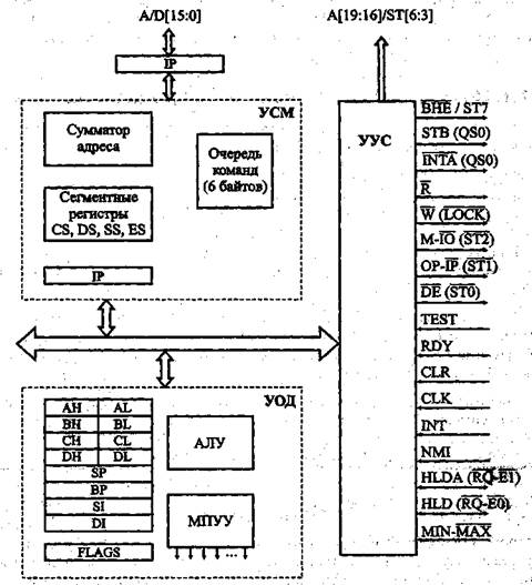 Рис. 6.1. Структура микропроцессора 18086 В табл. 6.1 приведено описание внешних выводов МП i8086. При описании выводов косой чертой (/) разделены сигналы, появляющиеся на выводе в разные моменты машинного цикла. В круглых скобках указаны сигналы, характерные только для максимального режима. Символ * после имени сигнала — знак его инверсии. Таблица 6.1. Внешние выводы МП i8086
