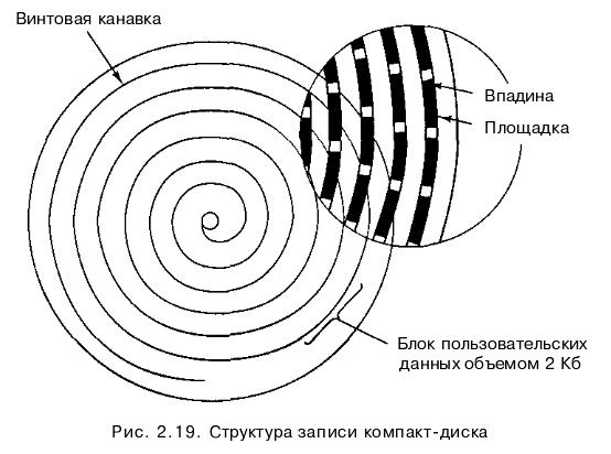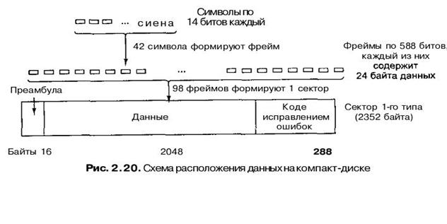 Чтобы музыка звучала нормально, впадины и площадки должны сменяться с постоянной линейной скоростью Следовательно, скорость вращения компакт-диска должна постепенно снижаться по мере продвижения считывающей головки от центра диска к внешнему краю Когда головка находится на внутренней стороне диска, скорость вращения составляет 530 оборотов в минуту, чтобы достичь желаемой скорости 120 см/с Когда головка находится на внешней стороне диска, скорость вращения падает до 200 оборотов в минуту, чтобы обеспечить такую же линейную скорость Диск с постоянной линейной скоростью отличается от магнитного диска, который работает с постоянной угловой скоростью, независимо от того, где находится головка в настоящий момент Кроме того, скорость вращения компакт-диска (530 оборотов в минуту) очень сильно отличается от скорости вращения магнитных дисков, которая составляет от 3600 до 7200 оборотов в минуту В 1984 году Philips и Sony начали использовать компакт-диски для хранения компьютерных данных. Они опубликовали Желтую книгу, в которой определили точный стандарт того, что они назвали CD-ROM (Compact Disc - Read Only Memory — компакт-диск — постоянное запоминающее устройство). Чтобы влиться в широко развернувшийся к тому времени рынок аудио-компакт-дисков, компьютерные компакт-диски должны были быть такого же размера, как аудио-диски, механически и оптически совместимыми с ними и производиться по той же технологии. Вследствие такого решения потребовались моторы, работающие с низкой скоростью и способные менять скорость. Стоимость производства одного компакт-диска составляла в среднем меньше 1 доллара. В Желтой книге определено форматирование компьютерных данных. В ней также описаны усовершенствованные приемы исправления ошибок, что является существенным шагом, поскольку компьютерщики, в отличие от любителей музыки, придают очень большое значение ошибкам в битах. Разметка компакт-диска состоит в кодировании каждого байта 14-битным символом. Как мы видели выше, 14 битов достаточно для того, чтобы закодировать кодом Хэмминга 8-битный байт, при этом останется два лишних бита. На самом деле используется более мощная сис- тема кодировки. Перевод из 16-битной в 8-битную систему для считывания ин-формации производится аппаратным обеспечением с помощью поисковых таблиц. На следующем уровне 42 последовательных символа формируют фрейм из 588 битов. Каждый фрейм содержит 192 бита данных (24 байта). Оставшиеся 396 битов используются для исправления ошибок и контроля. У аудио- и компьютерных компакт-дисков эта система одинакова. У компьютерных компакт-дисков каждые 98 фреймов группируются в сектор, как показано на рис. 2.20. Каждый сектор начинается с преамбулы из 16 байтов, первые 12 из которых- O0FFFFFFFFFFFFFFFFFFFFO0 (в шестнадцатеричной системе), что дает возможность проигрывателю определять начало сектора. Следующие 3 байта содержат номер сектора, который необходим, поскольку поиск на компакт-диске, на котором данные записаны по спирали, гораздо сложнее, чем на магнитном диске, где данные записаны на концентрических дорожках. Чтобы найти определенный сектор, программное обеспечение подсчитывает, куда приблизительно нужно направляться; туда помещается считывающая головка, а затем начинается поиск преамбулы, чтобы установить, насколько верен был подсчет. Последний байт преамбулы определяе
