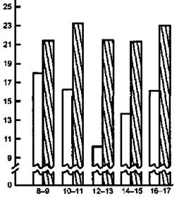 Обследование моими сотрудниками нескольких сотен спортсменов высокого класса показало, что у женщин, выступающих в игровых видах спорта, высокий нейро-тизм встречается значительно чаще, чем у мужчин - представителей тех же видов спорта (соответственно в 34 % и 12 %). Низкий же нейротизм чаще встречается у мужчин-спортсменов, чем у женщин-спортсменок (соответственно в 34 % и 13 %). Различия в склонности к переживанию базовых эмоций. Л. В. Куликовым выявлены значимые половые различия в самооценке печали, тревоги и вины. Сравнение склонности к переживанию базовых эмоций у школьников и школьниц разного возраста, проведенное М. С. Пономаревой, показало, что у девочек и девушек во всех возрастных группах склонность к страху выражена значительно больше, чем у мальчиков и юношей (рис. 16.6). Интересная возрастная динамика выявлена М. С. Пономаревой (Ильин, Пономарева, 2001) в отношении склонности к переживанию гнева и печали. Чем младше школьники, тем склонность к переживанию этих эмоций больше выражена у лиц мужского пола, и чем старше школьники, тем больше выражены эти склонности у лиц женского пола (рис. 16.7). Склонность к радости не обнаружила четкой возрастной динамики: в 8-9, 12-13 и 16-17 лет она выражена у мальчиков и девочек одинаково, а в возрасте 10-11 и 14-15 лет она выражена больше у девочек. Как показано К. Н. Сухановой (2001), мужчины чаще сдерживают проявление эмоций, чем женщины (60% против 40%), и больше нуждаются в эмоциональном участии (100 % и 60 %). При этом представители сильного пола чаще игнорируют эмоциональные проблемы (80 % против 30 %). Женщины чаще сохраняют эмоциональную безучастность в отношениях (60 % против 40 %). Автор приходит к выводу, что у мужчин эмоциональные проблемы маскируются или даже отрицаются на уровне самооценки. Различия в эмоциональных отношениях к другим. Среди дружащих девочек отношения более доверительные, чем среди мальчиков (Rubin, 1983). У девочек стремление к близким дружеским отношениям с противоположным полом завязываются раньше, чем у юношей (Sharabany, Gershony, Hoffman, 1981). Различия в свойствах эмоциональности. В литературе отмечается большая эмоциональная чувствительность и эмоциональная нестабильность женщин. Изучение этого вопроса В. Г. Пинигиным на школьниках и студентах с помощью оценок собственных жизненных проявлений выявило, что лица женского пола явно превосходят лиц мужского пола во всех возрастных группах по эмоциональной возбудимости (это соответствует приведенным ниже данным П. А. Ковалева о большей вспыльчивости лиц женского пола), в меньшей степени - по интенсивности, еще в меньшей степени - по длительности сохранения эмоций и эмоциональной устойчивости (рис. 16.8). Различия в эмоциональных свойствах и типах личности. Лица женского пола уделяют значительное большее внимание эмоциональным аспектам межличностных отношений и своим переживаниям. Считается, что они более эмпатичны. Однако авторы, изучавшие этот вопрос на детях 10-12 лет (Eisenberg, 1989; Eisenberget al., 1987), полагают, что это происходит потому, что девочки морально созревают раньше, чем мальчики. 16,10. Половые различия в эмоциональной сфере 411