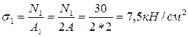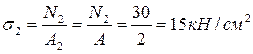 1. Поділяємо брус на ділянки. 2. Знаходимо значення поздовжньої сили N на ділянках бруса: Для ділянки І ∑X=F1-N1=0. Звідки N1=F1=30 кН Для ділянки ІІ ∑X=F1-NI1=0. Звідки N11=F1=30 кН Для ділянки ІІІ ∑X=F1-F2-NIII=0 Звідки NIII=F1-F2=F-2F=30-60= -30кН Для ділянки ІV ∑X=F1-F2-NIV=0 Звідки NIV= F1-F2=F-2F=30-60= -30кН Для ділянки V ∑X=F1-F2+F3 -NV=0 Звідки NV= F1-F2+F3 =F-2F+4F=30-60+120= 90кН Будуємо епюру поздовжніх сил. 3. Знаходимо значення нормальних напружень на кожній ділянці бруса: Для ділянки І для ділянки ІІ для ділянки ІІІ для ділянки ІV для ділянки V Будуємо епюру нормальних напружень.