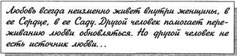 — Как ты похожа на меня! — сказала принцесса. — Была, — ответило отражение. — Теперь я живу в тебе. В комнату принцессы постучали. Вошли двое прелестных детей. — Бабушка! — обратились они к принцессе. — Все говорят, что ты самая добрая волшебница на свете, помоги нам стать счастливыми. Принцесса задумалась, взглянула на свои высохшие руки, провела пальцами по морщинистому лицу и вздохнула. — Взгляните в это зеркало, дети. Что вы там видите? — Прекрасную принцессу, — ответили детишки. — Ну что ж, теперь я верю, что сумею наколдовать вам счастье! Сердце ее было с ней, и его переполняли радость и любовь. Вот так, милые женщины. В ситуации инициации женщине очень легко поддаться переживаниям боли, страха, разочарования, обиды. Они основные искусители. Помните— это и есть ловушка! Главная задача женщины в ситуации инициации — сохранять любовь в своем сердце, искать новые источники, формы переживания любви, заниматься делами, поддерживающими любовь. Во что бы то ни стало. Вы спрашиваете, а что делать, если любви в сердце нет. В этом случае остается одно средство — глубоко вздохнуть и пойти ее искать. Собственно, в этом заключается сюжет многих женских сказок. Героиня отправляется искать любовь, спасать любовь, терпит лишения, учится прощать и отпускать, принимать несовершенство мира. Она приобретает опыт, мудрость и силу ощущать любовь в своем сердце. Оказывается, чтобы переживать любовь, _____________________________________________ 235 недостаточно одного желания, необходимо еще и мужество.