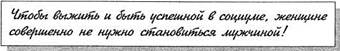 И если стервы внутри себя не находят покоя и гармонии, можно ли говорить о 100-процентной продуктивности этой технологии? Стервология хоть и помогает бороться за выживание, но «замораживает» Сердце. На заре перестройки одна дама, преподаватель маркетинга, сказала: «Я думаю, что бизнес в нашей стране будет женским, потому что женщинам надо будет выживать и кормить своих детей». Во многом сейчас женщина выживает, жертвуя своей женственностью или продавая собственную сексуальность. В этой инициирующей ситуации женщина борется за выживание, конкурирует с мужчиной и... проигрывает свое Сердце. Что же делать, спрашиваете вы? Ну как же?! Мы же с вами так долго говорили о том, что помогает женщине ориентироваться и быть успешной во внешнем мире! Да, здоровый слуга Эго, да, Инстинкт и, конечно же, архетипы Анимуса. Ловушка данной инициирующей ситуации в том, что женщину заставляют забыть об этих ресурсах и «стать мужчиной».