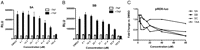 View larger version: · In this page · In a new window · Download as PowerPoint Slide Fig. 2. Silymarin and silymarin-derived flavonolignans block HCV induced oxidative stress. (A) Huh7.5.1 cells were infected or mock-infected with JFH-1 at a multiplicity of infection of 0.01 and 72 h later, cells were labeled with the dye H2DCFDA for 30 min using the Image-IT Live Green Reactive Oxygen Species kit (Molecular Probes/Invitrogen). On oxidation, H2DCFDA becomes highly fluorescent. Images were captured on a Nikon Microscope using MetaMorph software. (B) Huh7.5.1 cells were treated as described above except in addition to silymarin (SM), cells were also treated with 41.4 μM of each flavonolignan, 65.8 μM of taxifolin, or 100 U/mL of IFN-α. ROS were quantitated by pixel intensity. Abbreviations of compounds are listed in the legend to Fig. 1. NF-κB is the key transcription factor that is central to the induction of an inflammatory response (17). NF-κB transcription factors are homo- and heterodimeric complexes of proteins with molecular weights of 50 and 65 kDa (18). Inactive NF-κB is found in the cytoplasm via its association with inhibitory proteins of the IκB family. Stimulation of NF-κB activity involves phosphorylation of IκB-α on serine amino acid 32, phosphorylation of NF-κB on serine 536, followed by degradation of IκB-α, permitting NF-κB translocation to the nucleus and expression of inflammatory response genes (19, 20). Silymarin blocks NF-κB-dependent transcription from a canonical NF-κB promoter (9). Silymarin also blocked TNF-α activation of NF-κB dependent transcription from the positive regulatory domain (pRDII) domain of the IFN-B promoter, a key gene in antiviral defense (21) (Fig. S4 A). Silymarin reduced both p65 and IκB-α serine phosphorylation by about 20% and caused an approximate 20% decrease in TNF-α induced p50 and p65 nuclear translocation (Fig. S4 C and D). However, silymarin did not affect the ability of p50 or p65 to bind to the NF-κB promoter (Fig. S4 E). The data suggest that silymarin partially inhibits phosphorylation of IκB-α and p65/RelA and nuclear translocation of p50 and p65 subunits of NF-κB, but does not impair the ability of NF-κB to bind to DNA. Fig. 3 depicts examples of the effects on the pure compounds’ abilities to block TNF-α induced NF-κB-dependent transcription. In this assay, we were able to test higher concentrations of silymarin because the flavonolignans were only incubated with cells for 4 h. Silybin A and silybin B caused dose-dependent blockade of TNF-α induced NF-κB dependent transcription, with IC50s of 40 μM (Fig. 3 A and B and Table 1). Compared with silybin A and B, taxifolin induced the most-pronounced inhibition of NF-κB transcription at the lowest doses, but its effect appeared to plateau (Fig. 3 C).