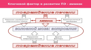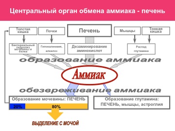 Патогенез печеночной недостаточности. Аммиак занимает центральное место в токсической теории развития ПЭ. В целом ряде исследований была показана прямая зависимость между уровнем аммиака и степенью ПЭ. Установлено, что уровень аммиака повышен у 90% больных, имеющих признаки печеночной энцефалопатии (Clemmesen J.O. et all. 1999, Kramer L. et all.,2000.,Venturini I.et all.,2001). Известно, что основным источником образования аммиака в организме является толстый кишечник, где под действием микрофлоры происходит расщепление белков, аминокислот, пуринов до конечного продукта –аммиака. Кроме толстого кишечника аммиак образуется так же в почках и мышечной ткани. Аммиак поступает в общий кровоток, при этом максимальная концентрация его отмечается в портальной вене, по которой он попадает в печень (Butterworth R.F.,1996, Norenberg M.D. 1996). При сохраненной функции печени основная часть аммиака включается в орнитиновый цикл, конечным продуктом которого является мочевина. В результате повреждения печени скорость метаболизма аммиака значительно снижается. В связи с этим часть аммиака через портальные анастомозы вновь возвращается в системный кровоток и проникает через гематоэнцефалический барьер (Mans A.M. et all., Lockwood A.H et all., 2001).