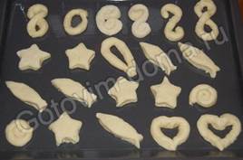 Сделать из теста различные фигурки при помощи фигурных выемок для печенья, или скатать жгутики и сделать печенья в виде восьмерок, завитушек, сердечек и т.п.