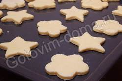 Готовое охлажденное тесто раскатать на посыпанном мукой столе в пласт, толщиной, ~4-8 мм и вырезать формочкой (обмакнув формочку в муку) или рюмкой печенье. Если нет формочек, можно разрезать пласт на ромбики или квадраты.