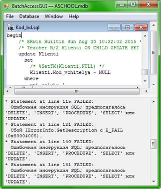 Драйвер Microsoft ODBC для SQL Server - це ізольований драйвер, який надає API-інтерфейс, який реалізує стандартні інтерфейси ODBC з Microsoft SQL Server. Генерацію схеми бази даних було зроблено для СУБД Аксес, використовуючи ODBC. Цей сервер виконує обслуговування та управління базою даних, відповідає за цілісність і збереження даних, забезпечує операції введення-виведення при доступі клієнта до інформації. За допомогою програми ER-Win було згенеровоно код для майбутньої бази даних, а вже потім за допомогою програми BatchAccess (консольна утиліта для управління базами MS Access), в яку був занесений код з ER-Win була створена база даних «Автошколи», генерацію бази даних наведено в рис. 3.2.1.