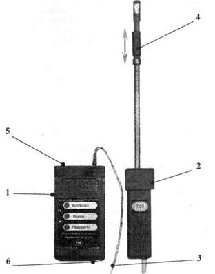 Рис. 2. Внешний вид прибора "ТКА-ПКМ"/50. 1. Блок обработки сигналов 2. Измерительная головка 3. Кабель связи 4. Защитный колпачок 5. Разъём RS232 6. Разъём зарядного устройства ОГЛАВЛЕНИЕ