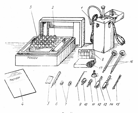 Рис. 2. Общий вид универсального переносного газоанализатора УГ-2 и комплектация принадлежностей к нему