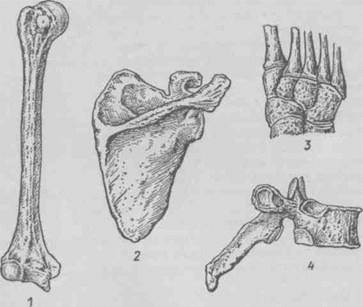 Рис. 2. Различные виды костей: 1 - длинная (трубчатая) кость, 2 — плоская кость, 3 - губчатые (короткие) кости, 4 — смешанная кость