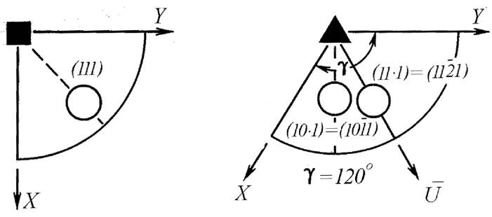 Так как в кристаллах гексагональной сингонии четырехосная координатная система – XYUZ, то в символе появляется дополнительный четвертый индекс i, соответствующий новой оси U, из-за чего символ становится четырехчленным – (hkil).