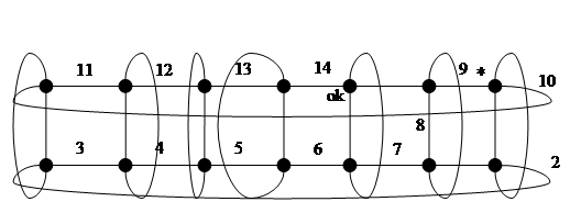 На рис. 27 и 28 показан порядок обхода торов 3 ´ 4 и 2 ´ 5. Звездочкой обозначен сайт – инициатор обхода, а буквами «ОК» – сайт, сообщающий о завершении обхода. Около ребра записано число – значение k, которое передается по этому ребру от одного сайта к другому.