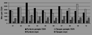 Рис. 1.2. Динаміка обсягів операцій купівлі та продажу за видами іноземних валютна готівковому валютному ринку України в 2012 році.