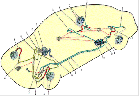 Рис. 4.1. Схема гідроприводу гальм: - Гальмівний механізм переднього колеса; 2 - гнучкий шланг переднього гальма; 3 - трубопровід контуру лівий передній - правий задній гальма; 4 - головний циліндр гідроприводу гальм; 5 - трубопровід контуру правий передній - лівий задній гальма; 6 - бачок головного циліндра; 7 - вакуумний підсилювач; 8 - гальмівний механізм заднього колеса; 9 - гнучкий шланг заднього гальма; 10 - регулятор тиску; 11 - педаль гальма