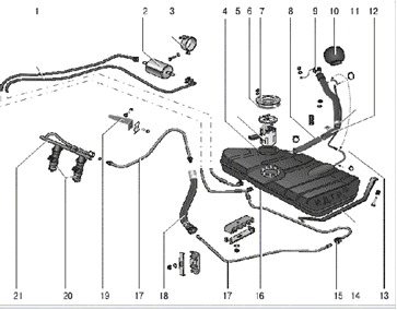 Паливний бак (Див. мал. 5.2) зварної, штампований, встановлений під підлогою кузова в його задній частині і закріплений двома сталевими хомутами 14. Щоб пари палива не потрапляли в атмосферу, бак з'єднаний через сепаратор 11 парів палива (див. рис. 5.4) і гравітаційний клапан 10 паропроводами 12, 13, 14 і 1 з адсорбером 15. Під фланцеве отвір у верхній частині бака встановлюють електричний модуль електробензонасоса (паливний насос) 5 (див. рис. 5.2), який об'єднує в собі власне насос, датчик покажчика рівня палива і регулятор тиску палива. У задній частині бака виконаний патрубок для приєднання наливної труби 12. З насоса паливо подається в паливний фільтр 2, встановлений знизу на підставі кузова, і звідти надходить в паливну рампу 21, закріплену на голівці блоку циліндрів двигуна. Із паливної рампи паливо впорскується форсунками 20 у впускні канали головки блоку циліндрів, причому факел палива спрямований на впускний клапан. Надлишки палива через регулятор тиску палива, встановлений в модулі електробензонасоса, зливаються в паливний бак. Така схема установки регулятора тиску палива, крім виключення довгого трубопроводу зворотного зливу, дозволяє запобігти підвищенню температури палива в баку, що викликає зайве пароутворення.