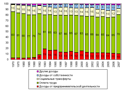 Состав денежных доходов населения России, 1970-2007 годы, %: