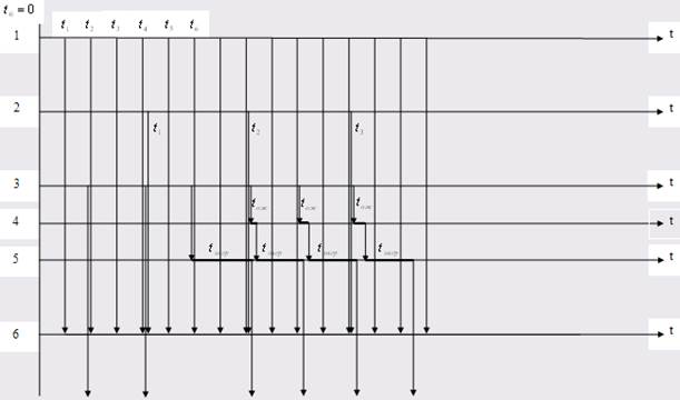 Более детально процесс функционирования можно представить на временной диаграмме (рис. 1.3.1). На диаграмме: · ось 1 – моменты поступления изделий A на склад; · ось 2 – моменты поступления изделий B на склад; · ось 3 – моменты времени, в которые к складу подъезжают машины; · ось 4 – пребывание машин в очереди на погрузку; · ось 5 – погрузка изделий в машины; · ось 6 – пребывание изделий на складе. С помощью временной диаграммы можно выявить все особые состояния системы, которые необходимо будет учесть при построении блок-диаграммы. Все описанное выше есть, по сути, этап построения концептуальной модели системы. Следующим должен стать этап формализации модели.