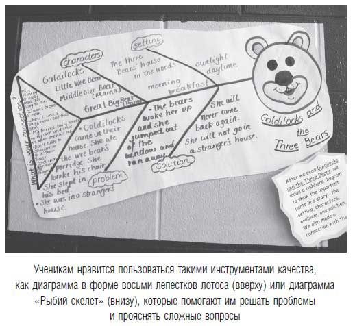 Ученикам нравится пользоваться такими инструментами качества, как диаграмма в форме восьми лепестков лотоса (вверху) или диаграмма «Рыбий скелет» (внизу), которые помогают им решать проблемы и прояснять сложные вопросы.