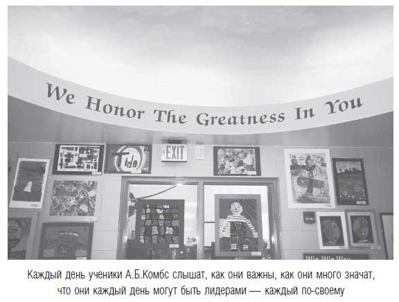 Язык, которым пользуются в холлах А.Б.Комбс, может многое рассказать о культуре школы. Вы постоянно слышите такие фразы: «Мы концентрируемся на возможностях», «Каждый день мы говорим им, что любим их», «Мы фокусируемся на том, что они могут сделать, а не на том, чего не могут», «Мы фокусируемся на позитиве», «Для нас важен каждый ребенок». Цитаты и информационные стенды, развешенные по всей школе, расскажут вам о том же. Как‑то утром два консультанта FranklinCovey пришли на встречу, назначенную в А.Б.Комбс, заранее и, выйдя из машины, сразу услышали голос Мюриэл, которая обращалась к детям по школьной громкой связи: «Дети, вы просто чудо. Вчера вы так прекрасно поработали, сделали все, что нужно. Не могу выразить, как я уважаю вас… И как я вас люблю». Один консультант повернулся к другому со словами: «Разве может ребенок после 6 лет пребывания в этой школе выйти ее стен, не чувствуя, что его любят, что он особенный, если ему все время говорят такое?» Учеников, приходящих с утра в класс, у дверей встречают учитель и ученик, отвечающий сегодня за приветствие, – Лидер Дня. Обычно они здороваются с учениками за руку, называют их по имени, нередко добавляют что‑то приятное о том, как каждый выглядит, или говорят о каком‑то его достижении. Очень редко день проходит без того, чтобы к ученику не обратились по имени, похвалили за что‑то.