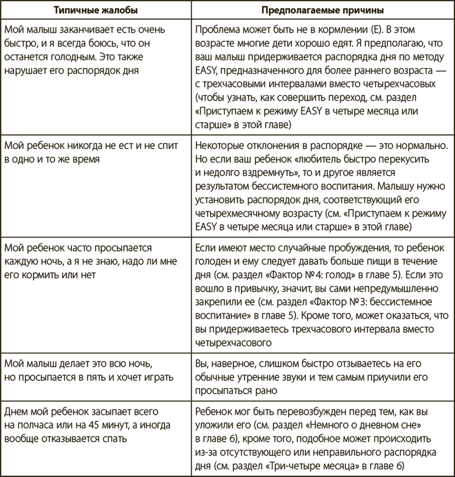 В дополнение к вышесказанному в этом возрасте также можно наблюдать серьезные трудности, с которыми родителям не приходилось сталкиваться прежде. Семена бессистемного воспитания, посеянные ранее, теперь начинают всходить в виде проблем с кормлением и сном. Мамы и папы оказываются перед лицом множества трудностей и не могут ничего отчетливо рассмотреть в этом хаосе. В одних случаях подобное происходит по причине того, что родители не адаптировали метод EASY к последующему развитию малыша. Они не осознали, что пора переходить от трехчасовых интервалов между кормлениями к четырехчасовым, что время активности ребенка увеличилось и что дневной сон так же важен, как сон в ночное время. В других случаях причина кроется в непоследовательности родителей. Они насобирали противоречивых советов от друзей и из разных книг, интернета и телевизора, пробовали применять то одну стратегию, то другую, постоянно меняя ребенку правила и надеясь, что у них что‑нибудь да получится. К тому же мама вышла на работу на полный или неполный день. Всякого рода перемены, происходящие в доме, могут нарушить привычный распорядок жизни малыша. Но как бы ни сложились обстоятельства, в этом возрасте проблема оказывается намного серьезнее, потому что она существует давно, – часто бывает, что ребенок не придерживался никакого распорядка с самого рождения. Я всегда задаю родителям малышей в возрасте четырех месяцев и старше вопрос: «Существует ли у вашего ребенка распорядок дня?» Если я слышу в ответ «нет» или «был когда‑то», я говорю, что надо начать с EASY. В конце этой главы приводится пошаговый план, который поможет вашему малышу перейти к правильному распорядку дня.