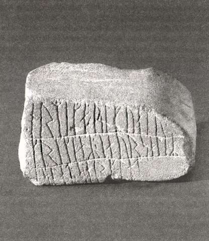 Маленький камень, покрытый руническими надписями, из Тиманса, остров Готланд, Швеция. В надписи упомянуты Иерусалим и Исландия. Конец XII века.