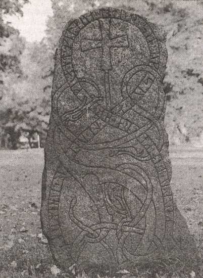 Рунический камень из Морбю, провинция Упланд, Швеция. XI век. Камень установлен в честь женщины по имени Гиллауг. На нем изображен Мировой змей, но центром композиции является христианский символ‑крест.