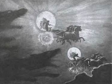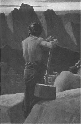 Сначала Тор, изогнув бровь, Шептал что‑то в рыжую бороду, Метая глазами, полными гнева, Молнии в разные стороны. Егоколесница, скрипя колесами, Посылала раскаты грома, А земля и небо сотрясались Под ударами его молота.