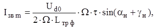 де Uк – напруга короткого замикання трансформатора, в.о.; W - кругова частота напруги мережі, с-1; Iзв m – максимальне значення зворотного струму, А; Idv - середній струм, який протікає через тиристор, А; Uv m - найбільше значення напруги на тиристорах, В. Максимальне значення зворотного струму: