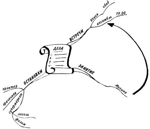 Теперь посмотрите на рис. 3.3. По мере того как мысли приходили мне на ум, я добавляла уточнения к ответвлению супермаркет ветви ОСТАНОВКИ, еще одну встречу и нарисовала новую ветвь ЗАНЯТИЕ в позиции «5 часов». Используя стрелку, я указала на связь между музыкой, которой я должна была заниматься, и репетицией ансамбля в 19.00. Наконец, взгляните на рис. 3.4. Здесь я добавила новую ветвь ЗВОНКИ в позиции «11 часов», а также еще две главные ветви, дополнительные детали и несколько изображений. Идеи добавлялись без определенного порядка. Они просто вносились на карту, как только приходили на ум.