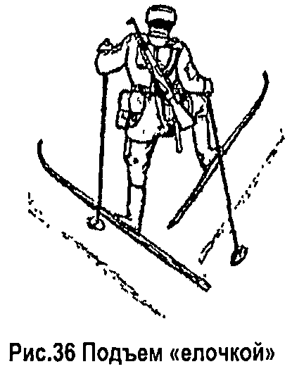 Подъем "елочкой". Применяется на склонах средней крутизны. При подъеме носки лыж широко разводятся в стороны и лыжи ставятся на внутренние ребра, чем круче подъем, тем шире разворачиваются носки лыж. Палки для отталкивания ставятся сзади лыж (рис. 36).
