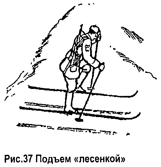 Подъем "лесенкой". Применяется на крутых склонах. Стоя боком к склону, переставить палку и сделать шаг вверх, в сторону подъема. Опираясь на палки и лыжу, стоящую выше по склону, приставить к ней вторую лыжу, затем переставить палку (рис. 37).