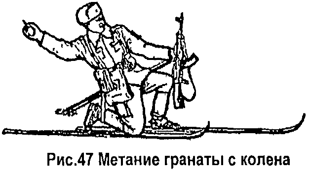 Метание гранаты с колена. Из положения для стрельбы с колена (с разворотом или без разворота лыжи) взять оружие в левую руку и, отклоняя туловище назад, повернуть его вправо, сделать замах и метнуть гранату (рис. 47).