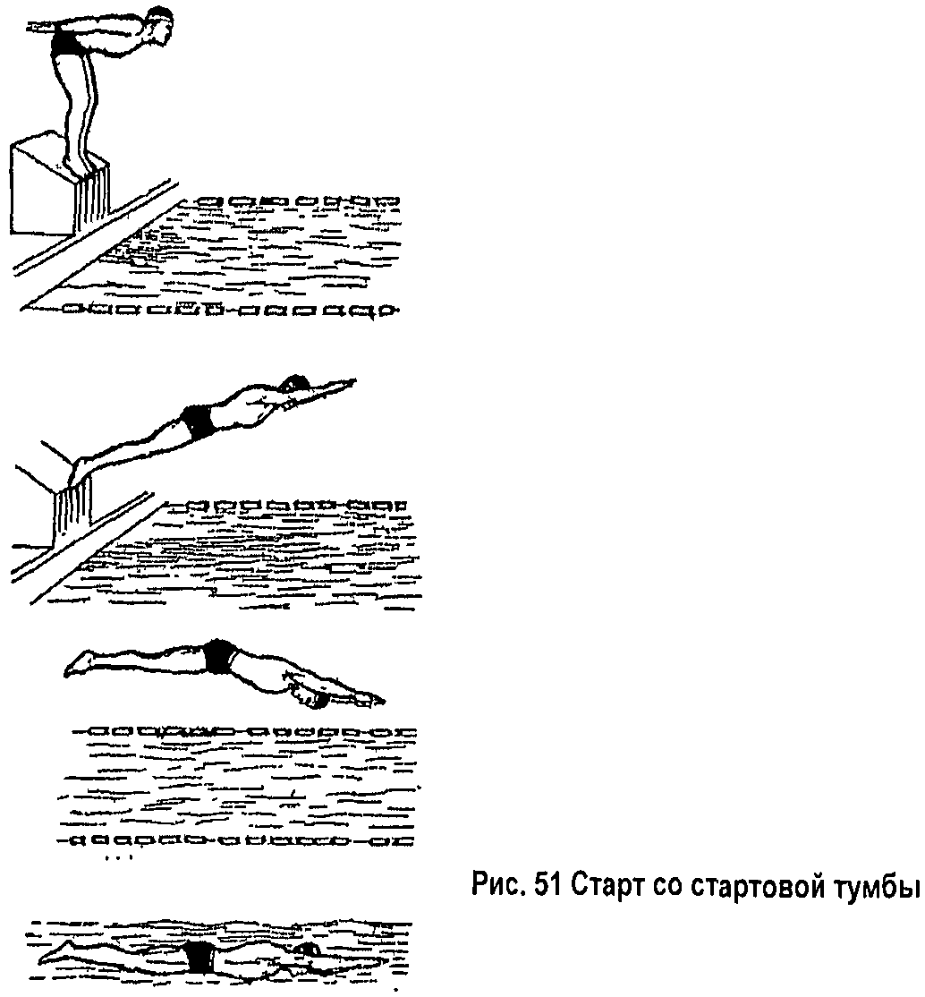 согласование движений рук, ног и дыхания выполняются в положении стоя с наклоном туловища вперед на три счета. На счет "РАЗ" - руки совершают гребок, производится вдох; на счет "ДВА" - руки сгибаются, одна нога поднимается и подготавливается к гребку, начинается вдох; на счет "ТРИ" - руки выпрямляются, нога выполняет гребок, продолжается выдох. В воде: многократное выполнение выдоха в воду; движения ногами лежа на груди (спине), держась руками за поручни; плавание одними ногами с доской в руках на 25, 50 и 100 м; плавание одними руками с доской в ногах на те же дистанции; плавание с согласованием движений рук и ног с дыханием; плавание на 25-100 м и более на согласование движений ног и рук с дыханием. 212. Для входа в воду со стартовых тумбочек подаются команды: "Участникам занять места". По этой команде военнослужащие становятся на дальний край тумбочки (бортика). По команде "На старт" - военнослужащие подходят к краю тумбочки (бортика) и изготавливаются к старту. По команде "МАРШ" - выполняется прыжок в воду. Вход в воду неумеющих плавать производится по лестнице (трапу, с борта бассейна) по команде: "Отделение, по трапу в воду шагом - МАРШ" или с продольного борта бассейна (водной станции) вниз ногами по команде: "Отделение, в воду прыжком вниз ногами - МАРШ". 213. Для выполнения физических упражнений в воде сначала называется способ плавания, а затем указываются дистанция и темп, после чего подается исполнительная часть команды, например: "Плавание одними ногами способом брасс на груди с учебной доской в руках, дистанция 200 м, темп средний, группа потоком, дистанция 5 м - МАРШ". Для прекращения упражнений подается команда "Упражнение - закончить". 214. Обучение способу плавания проводится в следующем порядке: ознакомление со способом плавания в целом и с его основными элементами; разучивание по элементам и в целом на суше; разучивание в воде движений ног, рук, дыхания и согласования движений ног, рук с дыханием. Во время показа руководитель занятия объясняет технику плавания: положение тела, движения ног, движения рук, дыхание и согласование движений ног, рук с дыханием. По мере овладения техникой плавания постепенно увеличивается расстояние и скорость плавания. На первых занятиях главное внимание уделяется отработке движений ногами и правильному дыханию. 215. Изучение старта проводится с помощью следующих упражнений: стартовые прыжки с бортика бассейна (водной станции) без взмаха руками, прыжки со стартовой тумбочки со взмахом руками, стартовые прыжки по команде руководителя (рис. 51).