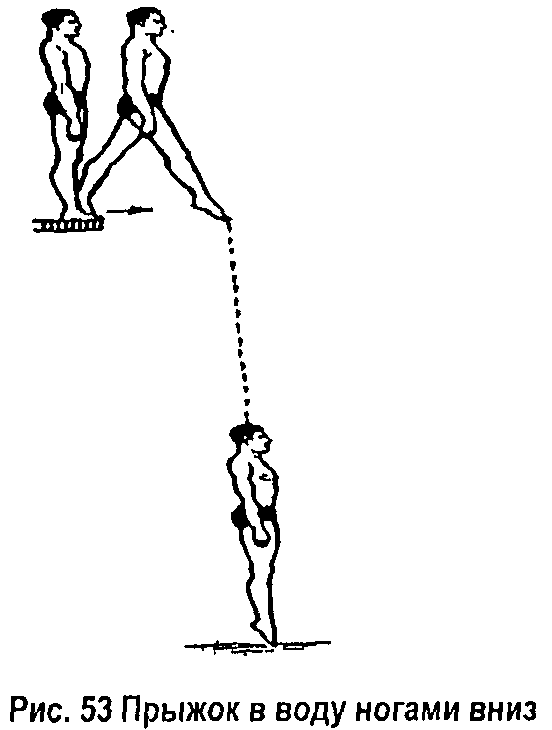 217. Обучение нырянию в длину проводится только со страховочным концом. Не допускается ныряние в местах с неисследованным дном или вблизи бонов, плотов, барж и других предметов, представляющих опасность при нырянии. 218. Разучивание прыжков в воду начинается с бортика бассейна (водной станции) при глубине не менее 1,5 м, с 3-метровой вышки - при глубине не менее 3,5 м, с 5-метровой вышки - не менее 4 м. После освоения прыжков в воду с бортика бассейна необходимо проводить их совершенствование: отрабатывать прыжки с вышки (вниз ногами, вниз головой) (рис. 53). Прыжки в воду в обмундировании с оружием выполняются только вниз ногами.
