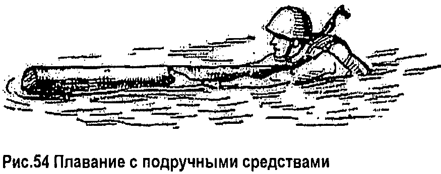 219. Плавание в обмундировании с оружием проводится как в индивидуальных спасательных средствах (спасательные жилеты; нагрудники, пояса), так и с поплавками из предметов обмундирования, снаряжения, подручного материала и без поддерживающих средств. 220. Подгонка обмундирования, снаряжения и оружия для плавания производится следующим образом: снять сапоги и уложить их голенищами за поясной ремень каблуками друг к другу взять автомат за спину. 221. Обучение плаванию с помощью подручных средств проводится в начале на суше, а затем в воде. На суше проводится обучение изготовлению подручных средств. На воде проверяется плавучесть изготовленных подручных средств, затем проводится обучение элементам техники плавания с их помощью. 222. При плавании с вещевым мешком его предварительно наполнить сеном, травой, соломой, горловину завязать и затянуть. Мешок берется горловиной от себя, ноги продеваются в лямки, после чего он закрепляется на пояснице поперечной лямкой. Сапоги снимаются и помещаются голенищами под поясной ремень каблуками друг к другу или укладываются в вещевой мешок. Плавание с вещевым мешком, укрепленным на пояснице применяется для переправы солдат, не умеющих плавать. Для этого не умеющий плавать берется руками за мешок отличного пловца и буксируется на противоположный берег. Поплавки из плащ-палатки, накидки или защитных чулок изготавливаются следующим образом: в плащ-палатку (плащ-накидку) кладутся легкоплавающий подручный материал или предметы обмундирования (шинель, сапоги, противогаз); затем она складывается в виде конверта и плотно сворачивается в валик-поплавок, который крепится на пояснице ремнем. С помощью поплавков переправляют раненых, ручные гранатометы пулеметы и боеприпасы, которые прикрепляются к поплавкам поясным ремнем или веревками. Переправы производятся буксировкой за веревку или подталкиванием сзади. При плавании с подручными средствами (бревнами, досками и так далее) взяться руками за предмет, а ногами производить гребковые движения. Короткие поленья, доски, связка хвороста закладываются под ремень на поясницу и надежно укрепляются. Плавание производится любым способом (рис. 54).