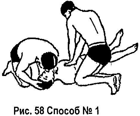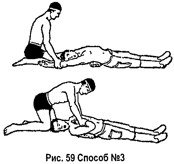 сесть на землю (на пол), расставить ноги, посадить пострадавшего между ног спиной к себе и обхватить его за туловище, пропустить руки ему под мышки; сильно сжать руками нижнюю часть груди (выдох) и тут же прекратить нажим развести руки приподнимая предплечьями руки пострадавшего до горизонтального положения (вдох); движения повторять 12-14 раз в минуту; положить пострадавшего на спину, под поясницу положить валик из одежды, раскрыть рот, вытянуть язык и прикрепить его к подбородку; встать на колени (колено) у головы пострадавшего, взять его за предплечье и отвести руки за голову, обеспечивая вдох, затем перенести согнутые в локтях руки на грудь и нажать ими на нижние ребра, обеспечивая выдох (рис. 59).