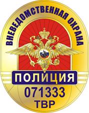 2. Описание нагрудного знака сотрудника патрульно-постовой службы. Нагрудный знак сотрудника патрульно-постовой службы выполнен из алюминия в форме овала золотистого цвета размером 75х60 мм и состоит из двух частей: основания и накладки с кодом знака. В центральной лучистой части основания красного цвета – изображение геральдического знака – эмблемы органов внутренних дел Российской Федерации и внутренних войск МВД России[10], под ней на трех горизонтальных полосах синий прямоугольник с закругленными углами и надписью «ПОЛИЦИЯ» золотистого цвета. Над центральной частью основания по кругу надпись «ПАТРУЛЬНО-ПОСТОВАЯ СЛУЖБА» синего цвета. Накладка с кодом знака золотистого цвета. Шрифт кода знака вдавленный с заливкой надписи символов синей эмалью. Код знака представляет собой комбинацию из шести цифр и буквенной серии (приложение № 1 к настоящим Рисункам и описанию нагрудных знаков сотрудников полиции). Крепление знака – заколка, комбинированная с откидным креплением для пуговицы. II. Рисунок и описание нагрудного знака сотрудника вневедомственной охраны 3. Рисунок нагрудного знака сотрудника вневедомственной охраны.