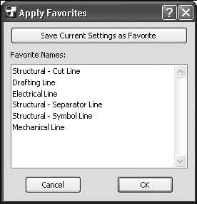 10. Закрыть окно Line Default Settings (Настройки параметров линии по умолчанию), нажав кнопку OK. Чтобы установить необходимую комбинацию параметров линии, нужно выполнить такую последовательность действий. 1. Открыть окно Line Default Settings (Настройки параметров линии по умолчанию). 2. Нажать кнопку Favorites (Избранное) – откроется окно Apply Favorites (Применить избранное) (см. рис. 3.6). 3. Щелкнуть кнопкой мыши на элементе списка с необходимой комбинацией настроек. 4. Нажать кнопку Apply (Применить) – текущие параметры линии по умолчанию заменятся параметрами выбранной комбинации.