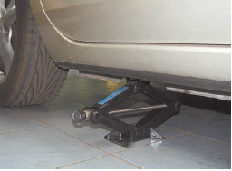 Еще одной проблемой для новичков являются колеса. К примеру, начинающие водители частенько забывают проверить состояние колес, прежде чем отправиться в дорогу. Речь даже не идет о проверке давления в шинах! Забывают и об обычном визуальном осмотре. Недавно автору довелось видеть колесо, у которого корд лопнул по центру беговой дорожки, резину выпучило бугром – вид был самый удручающий. Но что характерно, водитель признался, что целую неделю (!) у него ощущалось биение в рулевом колесе на любой скорости, только при 100 км/ч и выше оно стихало. Водитель всю неделю думал о том, что нужно бы подъехать на СТО, сделать диагностику, однако не только не собрался к специалистам, но даже не догадался осмотреть колеса собственного автомобиля! Данная история закончилась благополучно: возвращаясь к машине из магазина, водитель увидел наконец колесо. А если бы финал наступил во время движения? Замена колеса – процесс ответственный. И тут тоже есть свои нюансы: например, как поставить автомобиль на домкрат так, чтобы не повредить лакокрасочное покрытие (рис. 4.4).