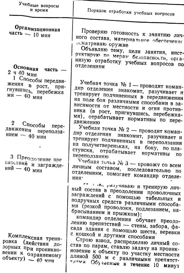 Тема: Передвижение на поле боя Занятие: Тактико‑строевое днем Учебная цель: научить личный состав скрытному и бесшумному передвижению, преодолению препятствий при выполнении разведывательных задач Время: 3 часа Материальное обеспечение: оружие и снаряжение – штатные, КРО – 1 компл; шесты – 2 шт, холостые патроны – 60 шт Руководства и пособия: Сборник нормативов по боевой под готовке, Учебно‑методическое пособие по одиночной подготовке, Строевой устав, Наставление по физической подготовке (НФП‑87)