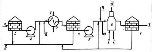 Подогретая эмульсия подаётся на отстой в резервуар 4 под водяную подушку. Опытным путём установлено, что высота водяной подушки должна быть порядка 50 – 70 % от общей высоты жидкости в резервуаре, но не менее 2 м. Время отстоя колеблется от нескольких часов до нескольких суток. Причём, отстойные резервуары могут работать как в периодическом, так и полунепрерывном и даже непрерывном режиме. Отстоявшаяся вода сбрасывается в линию сточной воды, а частично может подаваться на вход теплообменника 3 в качестве рециркулята. Промывка исходной эмульсии сточной водой призвана ускорить процесс отстоя. Описанная первая стадия применяется в том случае, если содержание воды в исходной эмульсии превышает 2 – 5 % мас. В противном случае, первая стадия из схемы установки исключается. Для осуществления второй стадии эмульсия с помощью насоса 5 после смешения с дополнительным количеством деэмульгатора (поток VIII), который подаётся при необходимости и пресной водой (поток IX) – обычно 2 – 5 % на нефть – прокачивается через подогреватель (в данном случае печь: V- топливо, VI – воздух, VII – дымовые газы) и с температурой 50 – 650С направляется на отстой в резервуар 7. Отмытая от солей нефть потоком Х выводится с установки, а отстоявшаяся вода сбрасывается в линию сточной воды, частично возвращаясь на циркуляцию для экономии расхода пресной воды. Подобные установки позволяют менять деэмульгаторы без изменения схемы и аппаратного оформления. Кроме того, они не только предельно просты, но и мало чувствительны к колебаниям в содержании воды в исходной эмульсии. Однако, в то же время, они характеризуются повышенными расходами деэмульгатора и тепла, а так же потерями лёгких фракций, за счет их испарения из нагретых эмульсий через клапаны резервуаров.