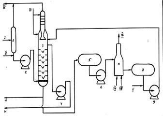 Даже при решающем влиянии деэмульгатора и температуры экспериментально установлено, что до тех пор, пока в эмульсии типа В/Н нефть будет сохраняться как дисперсионная среда, сохраняется возможность всё нового образования подобной эмульсии. И лишь при замене дисперсионной среды на водяную, являющейся ненормальной для данного типа эмульсии, подобную возможность можно свети к нулю. Водо – нефтяная эмульсия потоком 1 через резервный сепаратор 1 при 200С под давлением 1 – 1,5 атм после смешения с деэмульгатором (поток II), насосом 2 подаётся в нижнюю часть колонны комплексной подготовки 3, в верхнюю часть которой потоком III поступает горячая (65 – 700С) пресная вода. Газы из сепаратора и колонны потоком IV выводятся с установки. Ввод эмульсии обязательно должен осуществляться в виде капель или в крайнем случае плёнки, ибо при чрезмерном распылении образуется эмульсия типа Н/В, а при чрезмерном перемешивании новые порции эмульсии типа В/Н. Эмульсия, поднимаясь в таком виде через слой воды в колонне, обезвоживается, обессоливается и насосом 4 потоком V выводится с установки. Образовавшаяся в колонне сточная вода частично выводится с установки потоком VI, а частично возвращается в процесс насосом 9 после подогрева дымовыми газами (поток IX) в печи 7 и добавки свежей порции деэмульгатора, что позволяет существенно экономить пресную воду. Опыт эксплуатации подобной установки показал, что отходящие углеводородные газы и товарная нефть уносят с собой капельки воды, что потребовало сооружения добавочных отстойников для их отделения. Кроме того, наличие промежуточных ёмкостей 5 и 8, а также насоса 6 экономически не оправдано, не говоря уже о распылении воды в печи 7 и её прямом контакте с дымовыми газами, что помимо уноса вызывает повышение и без того немалой коррозионной активности сточной воды. Частично эти проблемы удалось решить изменив режим работы колонны так, чтобы уровень раздела фаз нефть – вода перенёсся из верхней части колонны в нижнюю. Для чего стали не пробулькивать эмульсию через слой воды, а пропускать воду через колонну, заполненную эмульсией. Однако, установка так и осталась опытной.
