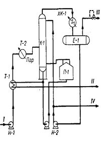 Схема установки стабилизации нефти: I-нестабильная нефть; II - стабильная нефть; III - несконденсировавщийся газ; IV - головка стабилизации (сжиженный газ).