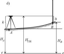 Нивелирование из середины – основной способ. Для измерения превышения точки B над точкой A (рис. 1 а) нивелир устанавливают в середине между точками (как правило, на равных расстояниях) и приводят его визирную ось в горизонтальное положение. На точках А и В устанавливают нивелирные рейки. Берут отсчет a по задней рейке и отсчет b по передней рейке. Превышение вычисляют по формуле h = a-b Обычно для контроля превышение измеряют дважды – по черным и красным сторонам реек. За окончательный результат принимают среднее. Если известна высота HA точки А, то высоту HВ точки В вычисляют по формуле: HB = HA+ hAB. (1) При нивелировании вперед (рис. 1 б) нивелир устанавливают над точкой A и измеряют (обычно с помощью рейки) высоту прибора k. В точке B, высоту которой требуется определить, устанавливают рейку. Приведя визирную ось нивелира в горизонтальное положение, берут отсчет b по черной стороне рейки. Вычислив превышение h = k – b, по формуле (1) находят высоту точки В. На строительной площадке, где на земляных работах, укладке бетона или асфальта и пр. требуется с одной стоянки нивелира определить высоты многих точек, сначала вычисляют общую для всех точек высоту H ГИ горизонта инструмента, то есть высоту визирной оси нивелира H ГИ = HA + k, а затем – высоты определяемых точек H 1 = H ГИ- b 1, H 2 = H ГИ- b 2, …, где 1, 2, … - номера определяемых точек. Если точки А и В, расположены так, что измерить между ними превышение с одной установки нивелира невозможно, превышение измеряют по частям, то есть прокладывают нивелирный ход (рис. 2).