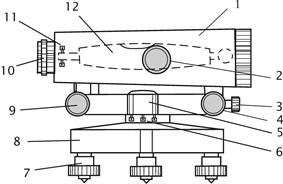 Рис. 3. Устройство нивелира Н-3: 1 - зрительная труба; 2 - фокусирующий винт зрительной трубы; 3, 4 – закрепительный и наводящий винты; 5 – круглый уровень; 6 – исправительные винты круглого уровня; 7 – подъемные винты; 8 - подставка; 9 – элевационный винт; 10 – окуляр с диоптрийным кольцом для фокусировки трубы по глазу; 11 – исправительные винты цилиндрического уровня; 12 – цилиндрический уровень. Вращая элевационный винт 9 (рис. 3), изменяющий наклон трубы 1 и цилиндрического уровня 12, приводят ось уровня в горизонтальное положение. Ось уровня горизонтальна, если его пузырек находится в нульпункте, на что указывает совмещение концов изображений половинок уровня в поле зрения трубы (рис. 4). Отсчет берут по среднему штриху сетки нитей.