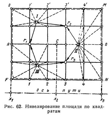 Разбивку сети квадратов на местности начинают обычно с разбивки линии АВ (рис. 62), расположенной на середине снимаемого участка.